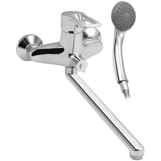 Смеситель хромированный в ванную/душевую комнату с длинным, плоским изливом, тяжёлый, массивный корпус, шаровый с дивертором м/к на корпусе. Материал изготовления — ЦАМ 40;цинк-алюминий-медь нержавеющая сталь , Картридж d=40мм, ручка с дыркой , аэратор для экономии воды, чашки и эксцентрики из нержавеющей стали. Габаритные размеры: ширина 150 мм, высота корпуса 160 мм, длина излива 330 мм, душевая лейка 85 мм, шланг 150 см, вес - 2,600 кг, объём - 0,00864 м3. В комплекте паспорт, корпус с изливом, дивертор, душевая лейка, шланг, кронштейн , комплект крепежа и прокладок.