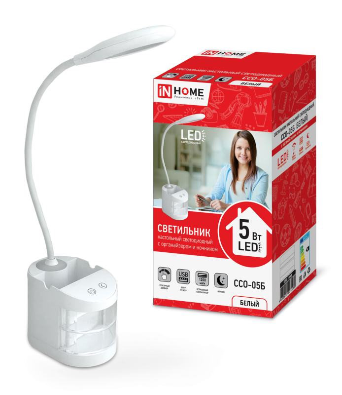 Светильник ASD/InHome настольный св/д ССО-05Б 5W 4K акк.1200mAh сенсор/диммер, органайзер, USB, 5582