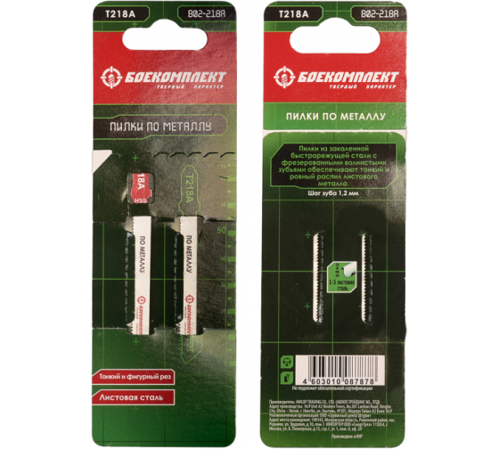 Пилки БОЕКОМПЛЕКТ B02-218A предназначены для электролобзика. Применяются для криволинейного реза. Обеспечивают тонкий рез листовой стали. Изготовлены из быстрорежущей стали. Пилки проходят обработку травления и фосфотирования, что обеспечивает им дополнительную прочность и длительный ресурс. Тело пилок после термической и химической обработки окрашивается, что дает защиту от коррозии. Оснастка имеет универсальный Т-образный хвостовик.