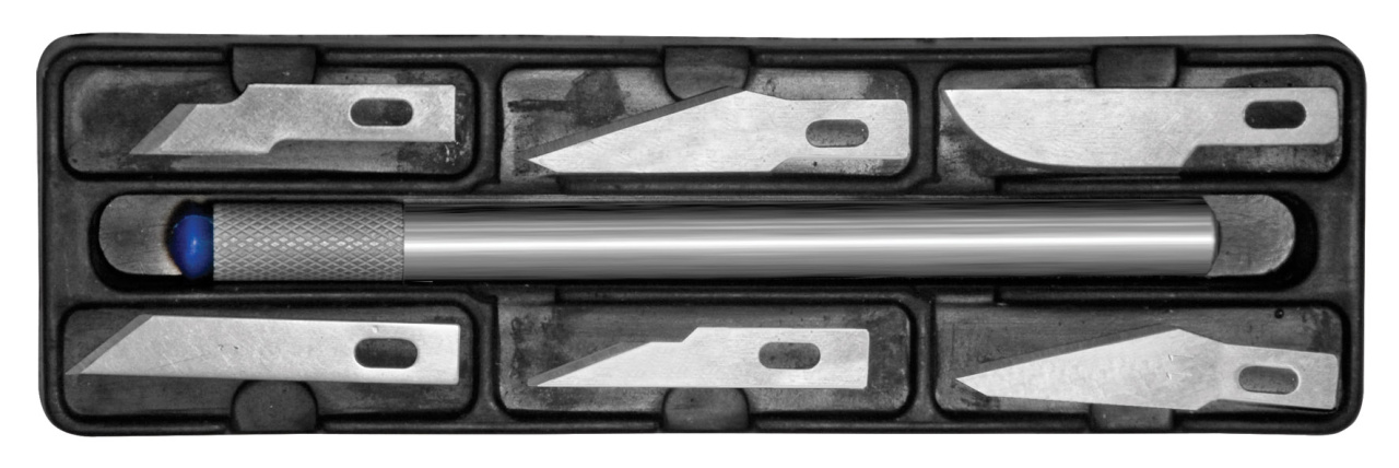 Резак и 6 лезвий в пластиковом футляре. Для резки бумаги, ткани, пластика, кожи, мягких пород древесины (напр.бальза) и других художественных работ. Материал: алюминиевый корпус, пластик, лезвия из инструментальной стали. Упаковка : блистер.