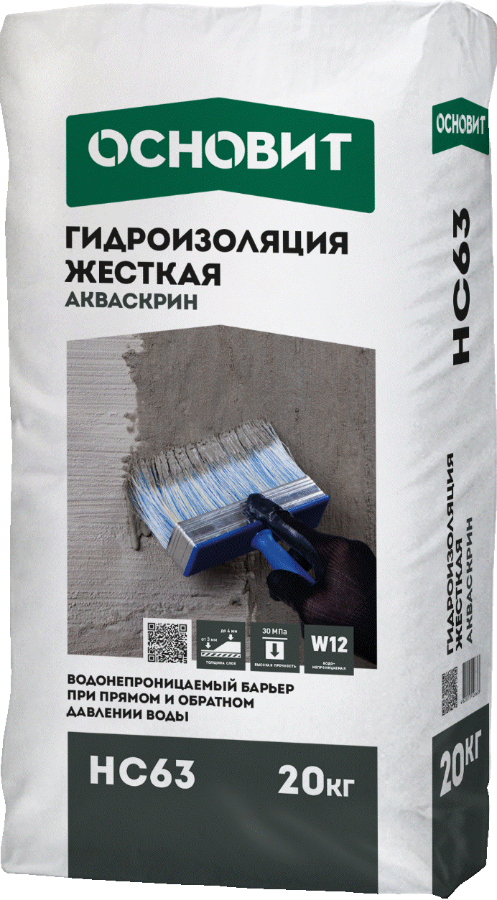Гидроизоляция жесткая ОСНОВИТ АКВАСКРИН НС63 предназначена для гидроизоляции фундаментов зданий, фасадов, цоколей, подвалов, балконов, террас, стен и полов во влажных помещениях.