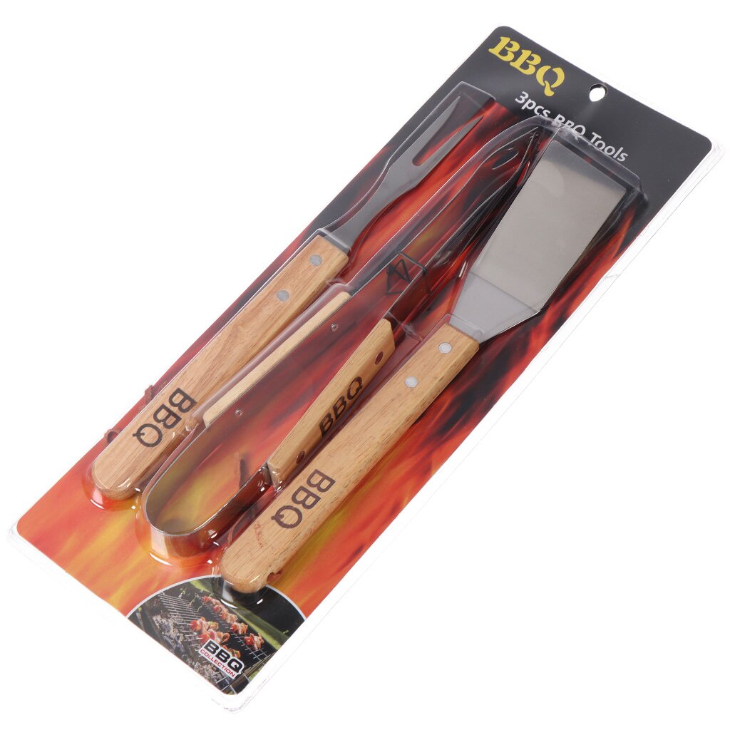 Набор для барбекю костровой, нержавеющая сталь, дерево, 3 предмета, рукоятка дерево, лопатка, щипцы,