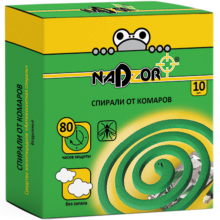 Спирали от комаров NADZOR малодымные без запаха зеленые 10штук в упаковке/60